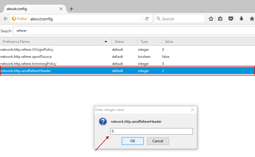 Дважды нажмите на строку “network.http.sendRefererHeader”, измените значение с “2” на “0” и нажмите “OK”.